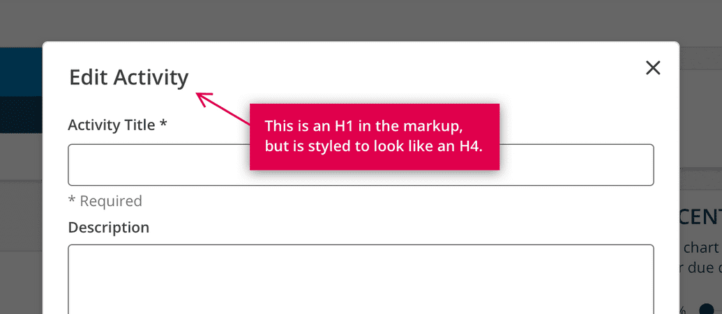 One example of this is in the Modal component. For optimal accessibility the title of the modal needs to be an H1, but we definitely don't want it to be styled with text that large. So we use an H1, but apply the Productive Heading Small style to it. This flexibility allows consumers of Magma to design using the styles that work best for the UI, but still have a clear informational hierarchy for assistive technologies.