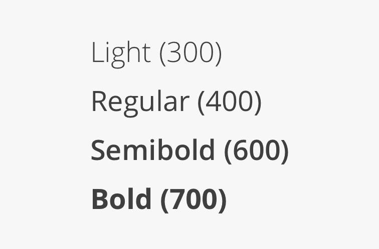 Font weight is an important typographic variable that can add emphasis and differentiate content hierarchy. Font weight and size pairings must be carefully balanced. A bold weight will always have more emphasis than a lighter weight font of the same size. However, a lighter weight font can rank hierarchically higher than a bold font if the lighter weight type size is significantly larger than the bold one. The weights available in React Magma are light (300), regular (400), semi-bold (600) and bold (700).