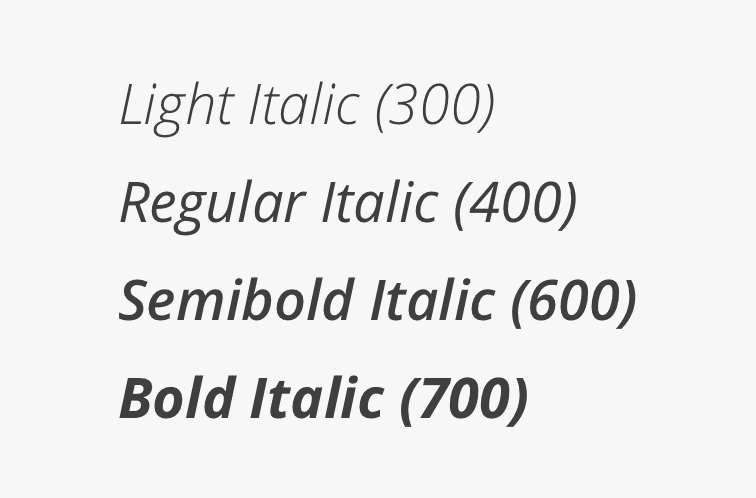 Each weight has an italic style, which should only be used when you need to emphasize certain words in a sentence (titles of works, technical terms, names of devices, captions, etc.).