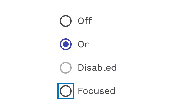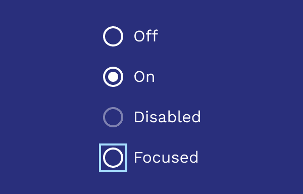 Radio buttons can be off or on. Radio buttons have enabled, focused and pressed states.