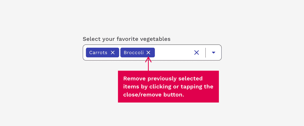 Multiselects are exactly what the name implies – A Select input that allows the user to choose multiple values to be submitted at the same time. Previously selected options may be removed with the associated close/remove button.